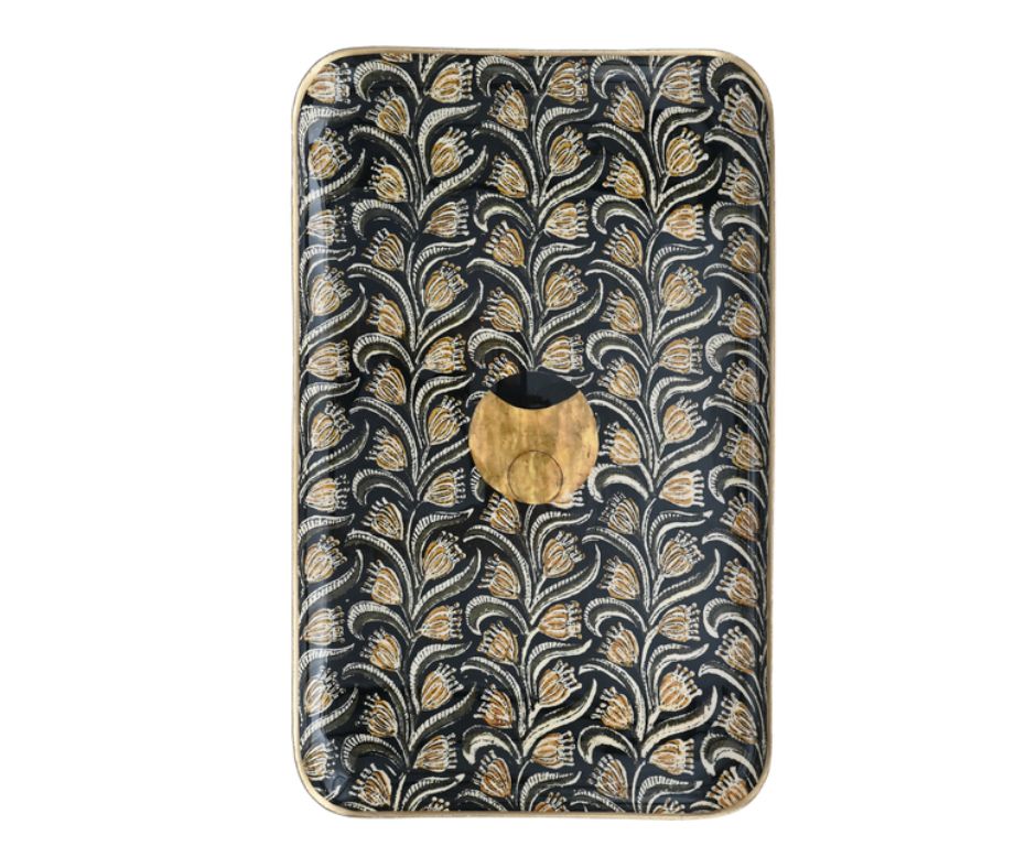 Realizada en aluminio esmaltado. En color gris oscuro y motivos ocres con borde dorado y acabado a mano.