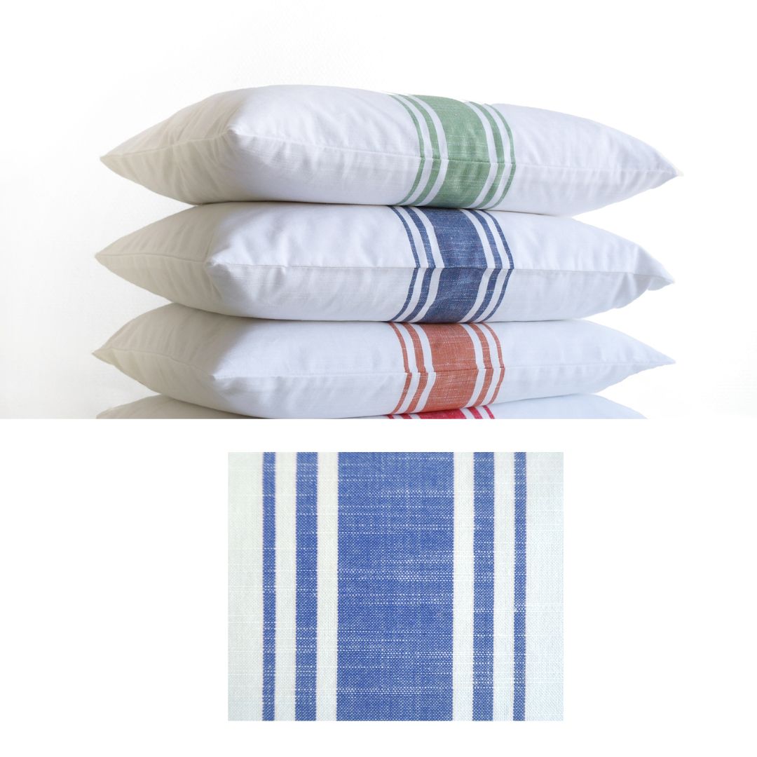 Cojín en color blanco con rayas centrales. Está confeccionada en 100% algodón, con una textura similar al lino. Incluye relleno de material acrílico.