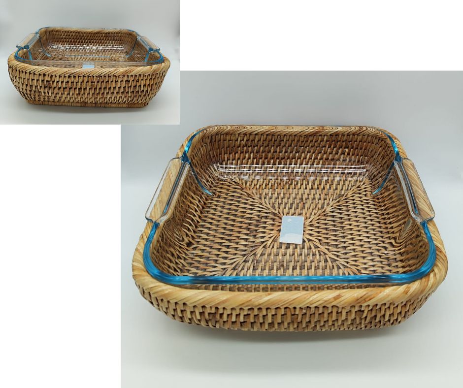 Fuente de horno compuesta por un recipiente de cristal de borosilicato tipo pyrex resistente al calor y una cobertura exterior de ratán.