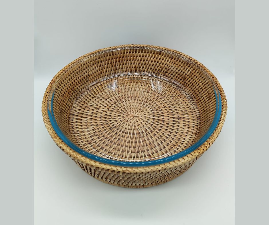 Fuente de horno compuesta por un recipiente de cristal de borosilicato tipo pyrex resistente al calor y una cobertura exterior de ratán.